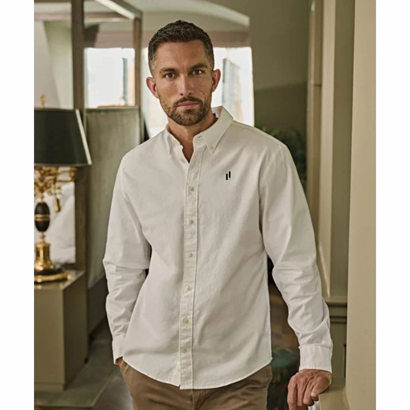 Shaped fit. Button-down collar. Fused collar and cuffs. Back yoke with box pleat. Inside hanger loop. Curved hem. Stretch fabric. Ascolite button wrapping.
